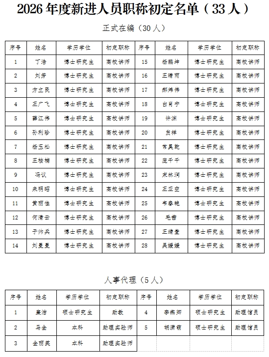 根据《中共安阳工学院委员会 安阳工学院关于印发专业技术人员职称初定办法(试行)的通知》(安工党〔2023〕56号)文件精神,现对2026年度新进职称初定人员予以公示,名单附后: